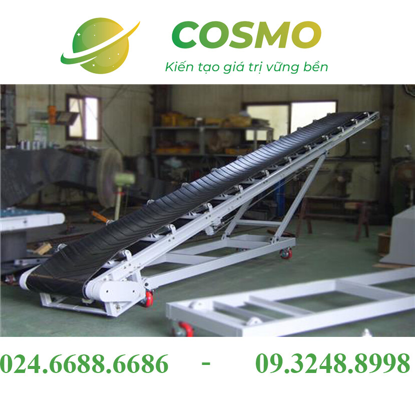 – Conveyors for loading and unloading goods into containers with solid structure, wheel frames to ensure mobility and easy movement in the workshop. The rubber belt conveyor belt operates smoothly, stably and safely without wire deflection causing material to fall out.