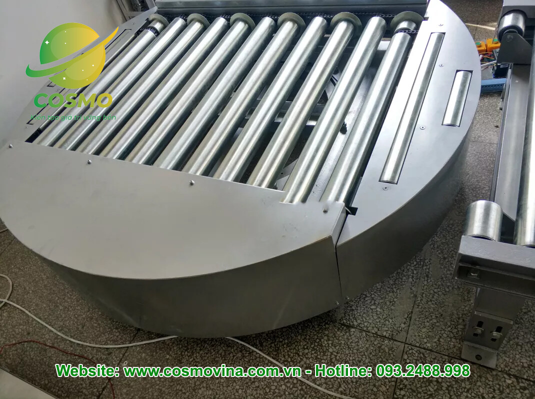 Băng tải bàn xoay 90 độ dùng để quay sản phẩm 90 độ. Các con lăn chuyển tiếp CDLR được cung cấp năng lượng, được gắn trên tạp dề của bàn xoay, giúp di chuyển sản phẩm lên và ra khỏi bàn xoay. Có sẵn các phần con lăn trọng lực chuyển tiếp tùy chọn (để lấp đầy khoảng trống do bán kính của bàn xoay) tạo ra.