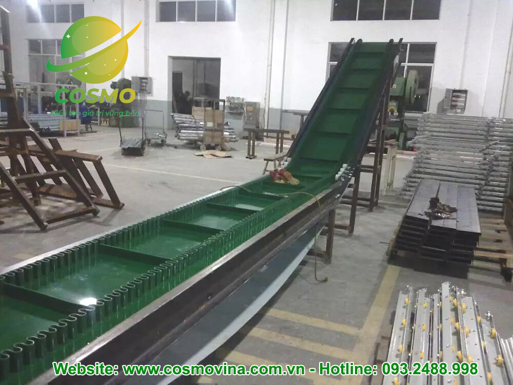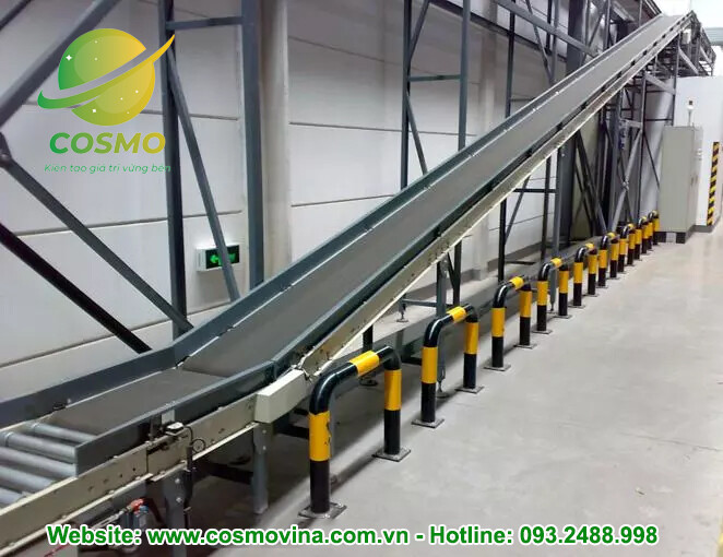 Băng tải nghiêng có thiết kế dạng góc, hoàn toàn phù hợp để sử dụng trong không gian hạn chế.
