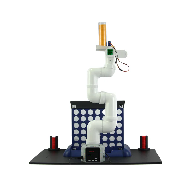 Bộ trò chơi Connect 4 cung cấp trải nghiệm học tập về thị giác robot và ứng dụng, bao gồm cánh tay myCobot 280, đầu gắp, camera, bàn cờ, và hỗ trợ chơi game cùng học tập thực hành độc đáo với thư viện Python mã nguồn mở.